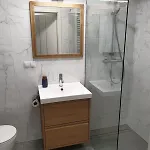 Rummen på lägenheten Apartamenty Kepa Mieszczanska har utsikt över trädgården. Badkar och dusch finns i badrummet.